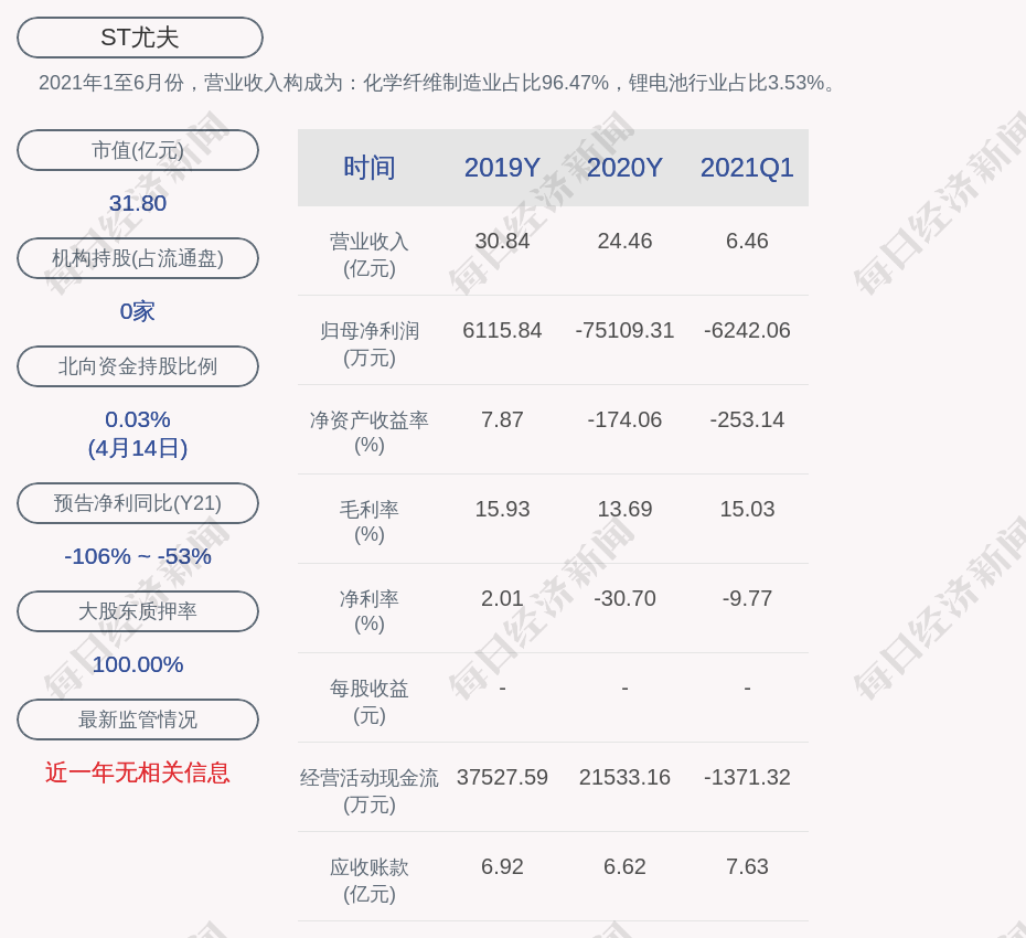 2021年1至6月份,ST尤夫的营业收入构成为:化学纤维制造业占比96.47%,锂电池行业占比3.53%。