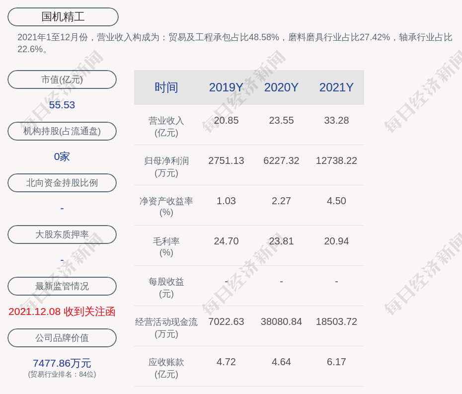 2021年1至12月份,国机精工的营业收入构成为:贸易及工程承包占比48.58%,磨料磨具行业占比27.42%,轴承行业占比22.6%。