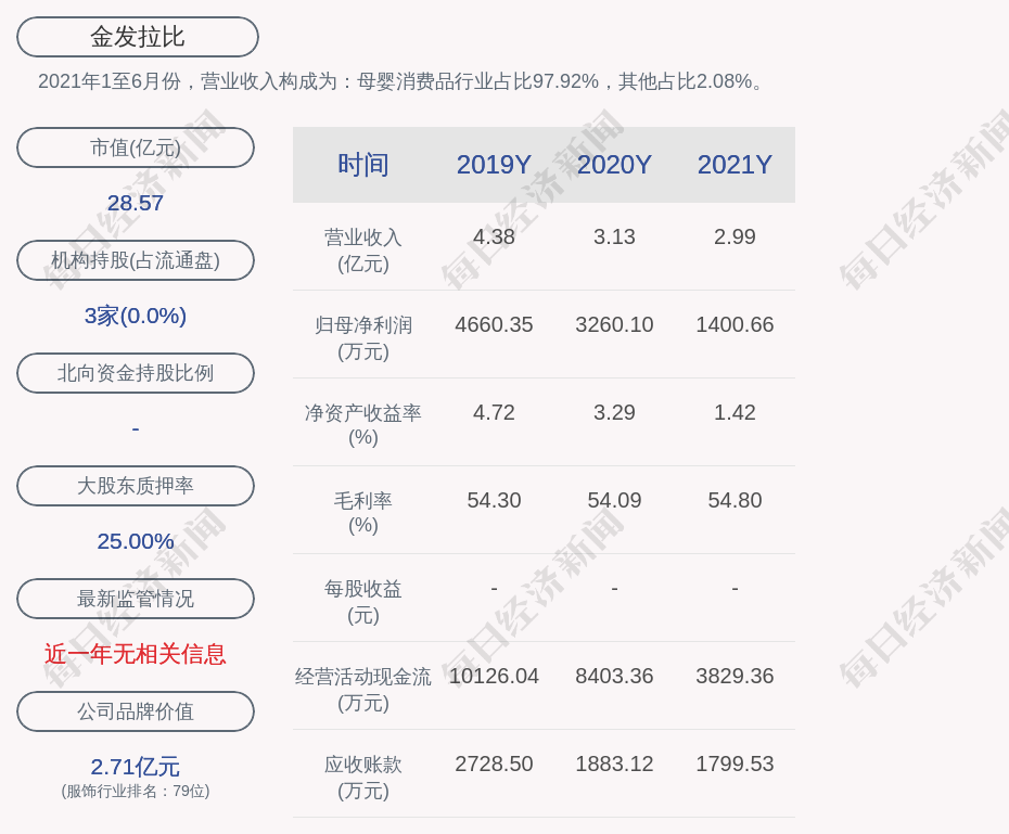 2021年1至6月份,金发拉比的营业收入构成为:母婴消费品行业占比97.92%,其他占比2.08%。