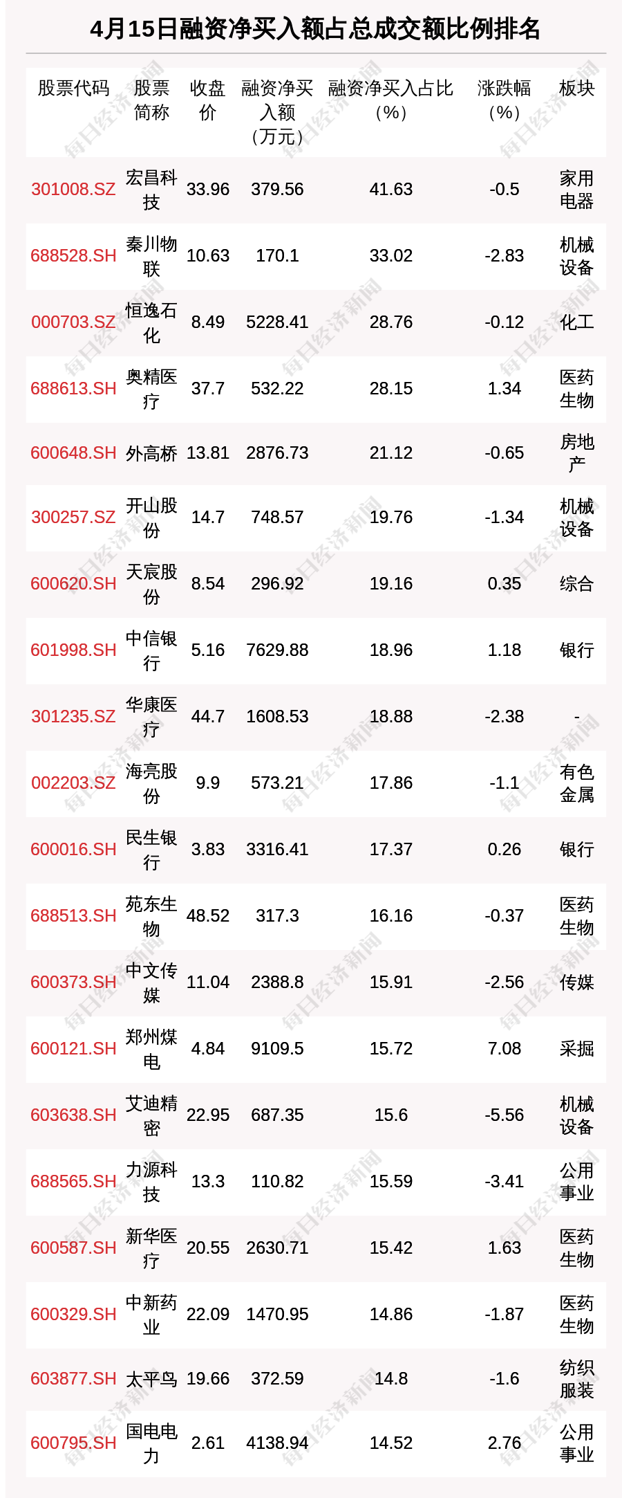 4月15日两市共有766只个股有融资资金净买入。共有30只股票融资净买入额占总成交金额比例超10%,其中宏昌科技、秦川物联、恒逸石化排名前三,占比分别为41.63%、33.02%、28.76%。