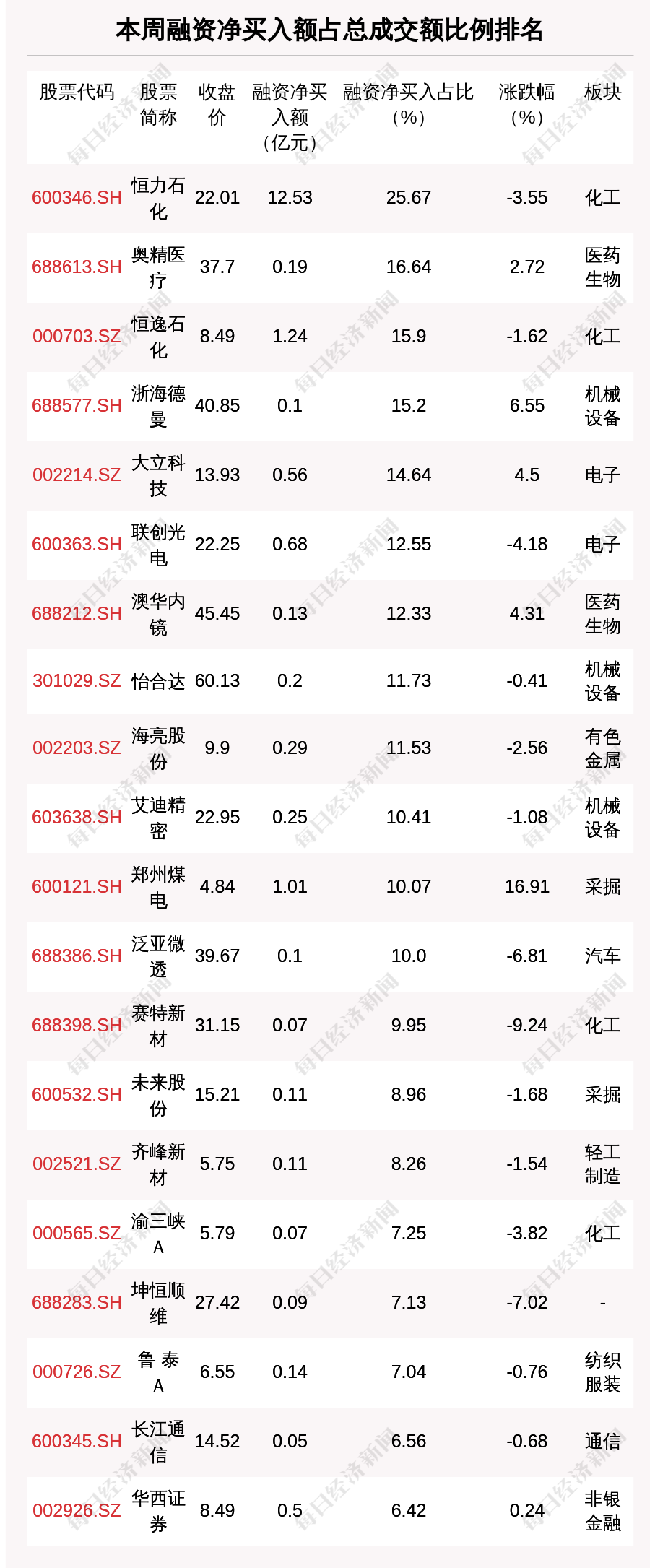 两市共有12只股票融资净买入额占总成交金额比例超10%,其中恒力石化、奥精医疗、恒逸石化排名前三,占比分别为25.67%、16.64%、15.9%。
