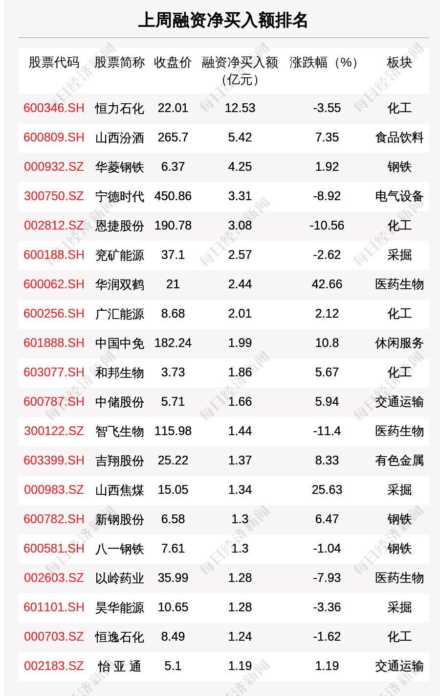 上周两市共有716只个股有融资资金净买入,共有1只个股净买入金额超10亿元,其中恒力石化、山西汾酒、华菱钢铁排名前三,买入金额分别为12.53亿元、5.42亿元、4.25亿元。