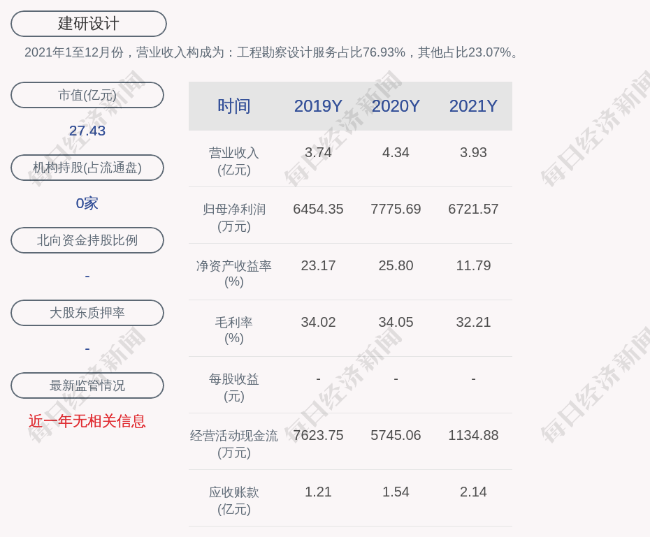 2021年1至12月份,建研设计的营业收入构成为:工程勘察设计服务占比76.93%,其他占比23.07%。