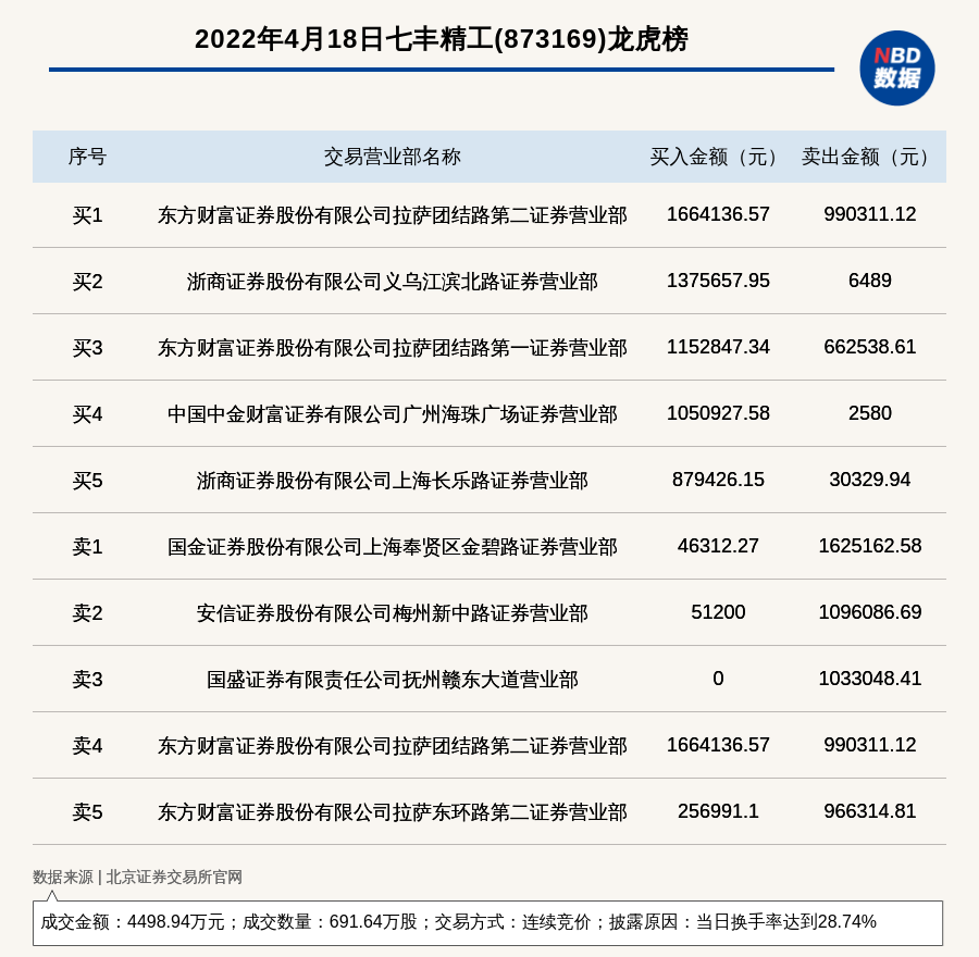 每经讯,2022年4月18日,北交所上市公司七丰精工(873169)登上龙虎榜,交易方式是连续竞价,披露原因是当日换手率达到28.74%,成交数量691.64万股,成交金额4498.94万元。买一席位为东方财富证券股份有限公司拉萨团结路第二证券营业部,买入166.41万元;卖一席位为国金证券股份有限公司上海奉贤区金碧路证券营业部,卖出162.52万元。