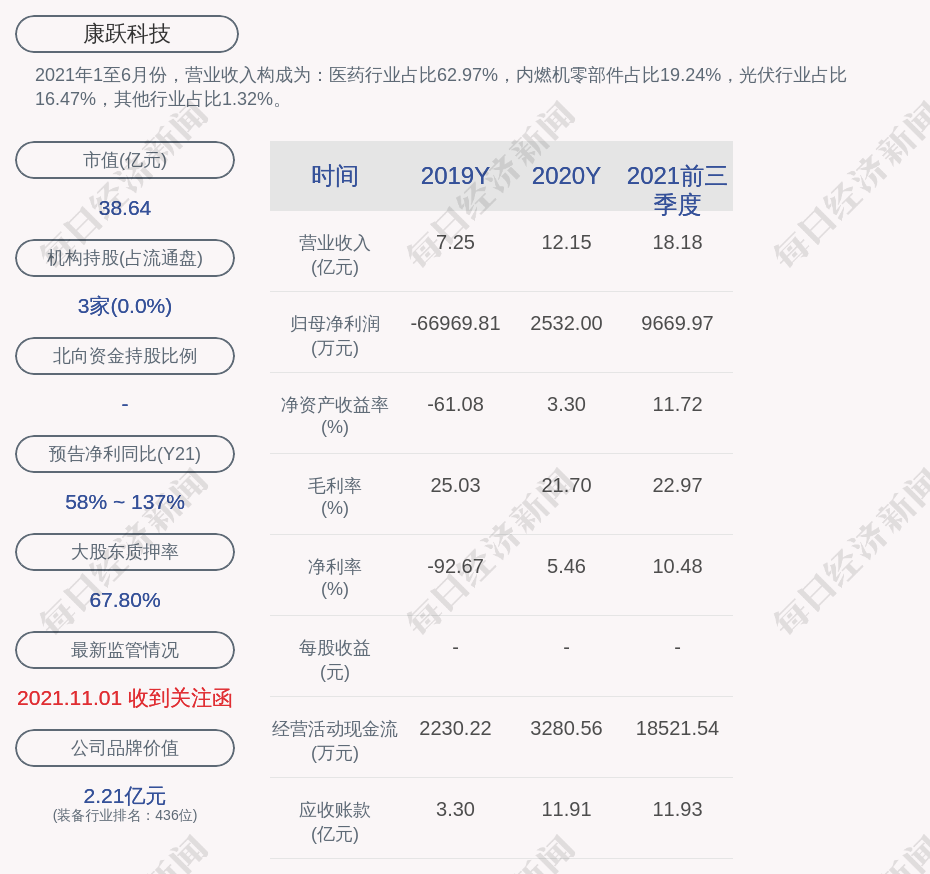 2021年1至6月份,康跃科技的营业收入构成为:医药行业占比62.97%,内燃机零部件占比19.24%,光伏行业占比16.47%,其他行业占比1.32%。