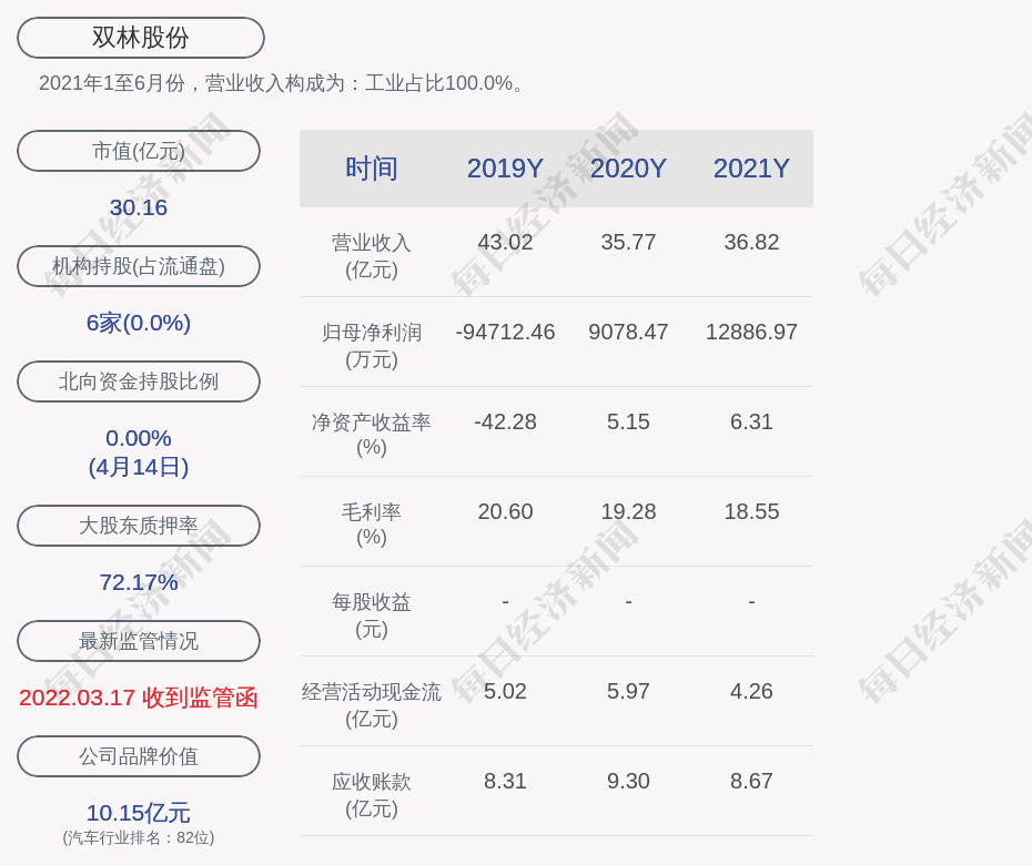 2021年1至6月份,双林股份的营业收入构成为:工业占比100.0%。