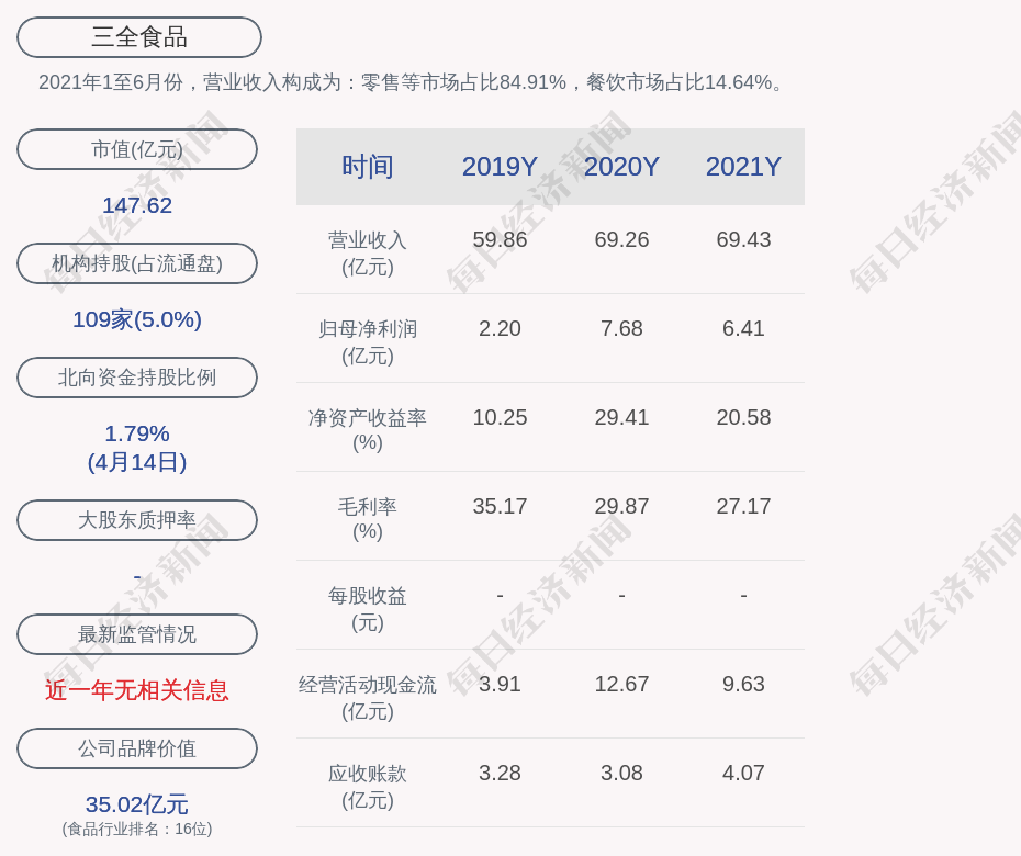 2021年1至6月份,三全食品的营业收入构成为:零售等市场占比84.91%,餐饮市场占比14.64%。