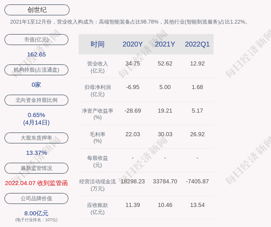 2021年1至12月份,创世纪的营业收入构成为:高端智能装备占比98.78%,其他行业(智能制造服务)占比1.22%。