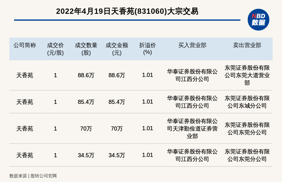 每经讯,2022年4月19日,新三板基础层公司天香苑(831060)发生4笔大宗交易,总成交金额为278.5万元,成交金额最高的一笔成交价1元/股,成交数量88.6万股,成交金额88.6万元,溢价1.01%。买入营业部是华泰证券股份有限公司江西分公司,卖出营业部是东莞证券股份有限公司东莞大道营业部。