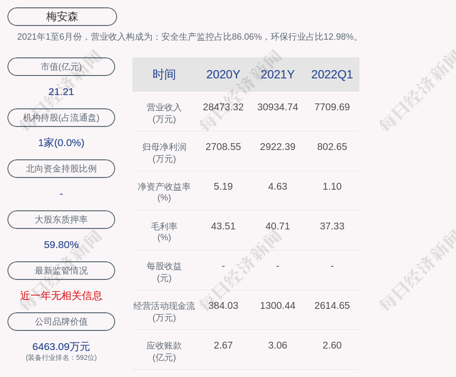 2021年1至6月份,梅安森的营业收入构成为:安全生产监控占比86.06%,环保行业占比12.98%。