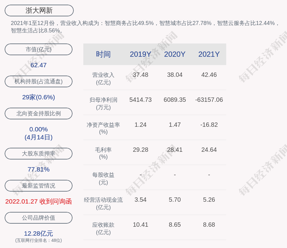 2021年1至12月份,浙大网新的营业收入构成为:智慧商务占比49.5%,智慧城市占比27.78%,智慧云服务占比12.44%,智慧生活占比8.56%。