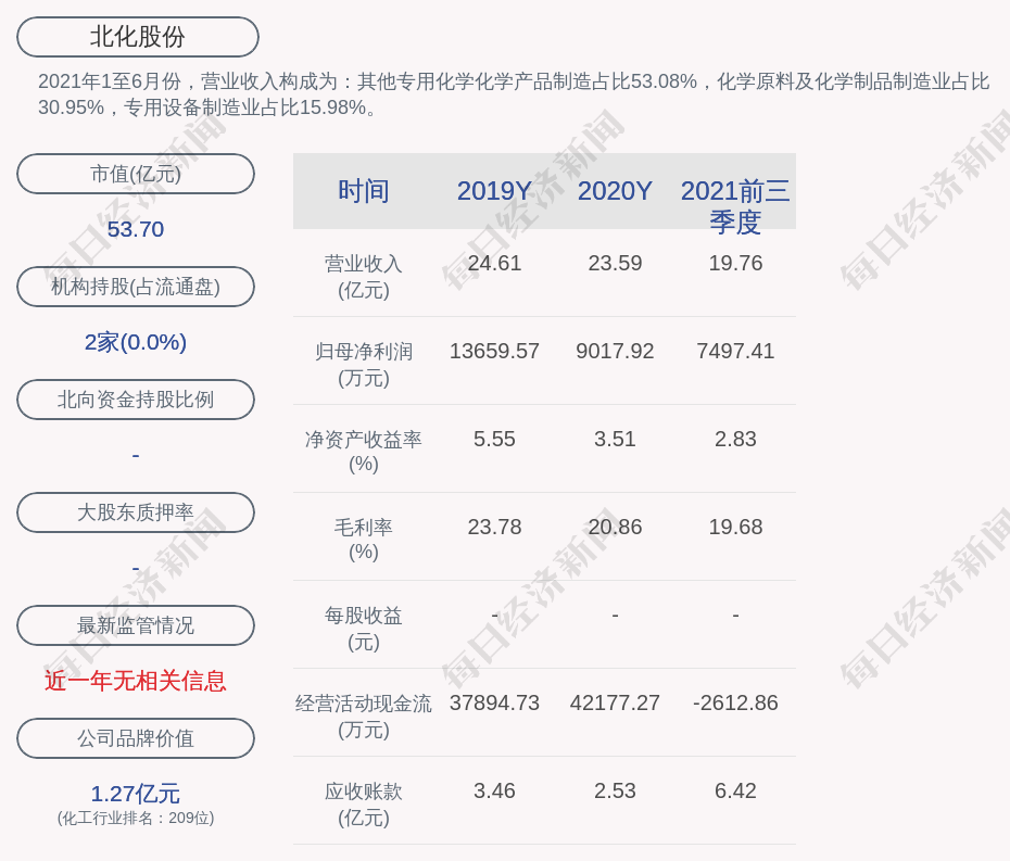 2021年1至6月份,北化股份的营业收入构成为:其他专用化学化学产品制造占比53.08%,化学原料及化学制品制造业占比30.95%,专用设备制造业占比15.98%。