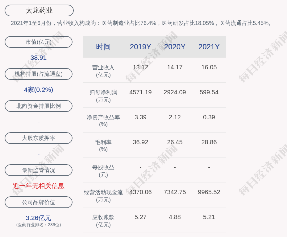 2021年1至6月份,太龙药业的营业收入构成为:医药制造业占比76.4%,医药研发占比18.05%,医药流通占比5.45%。
