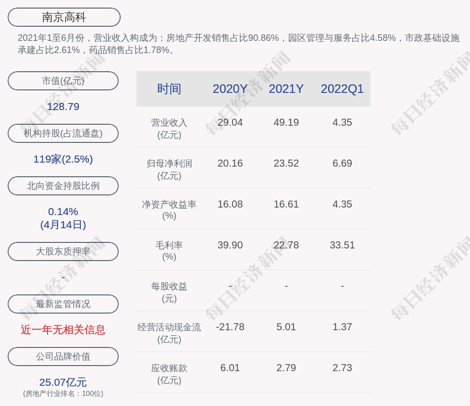 2021年1至6月份,南京高科的营业收入构成为:房地产开发销售占比90.86%,园区管理与服务占比4.58%,市政基础设施承建占比2.61%,药品销售占比1.78%。
