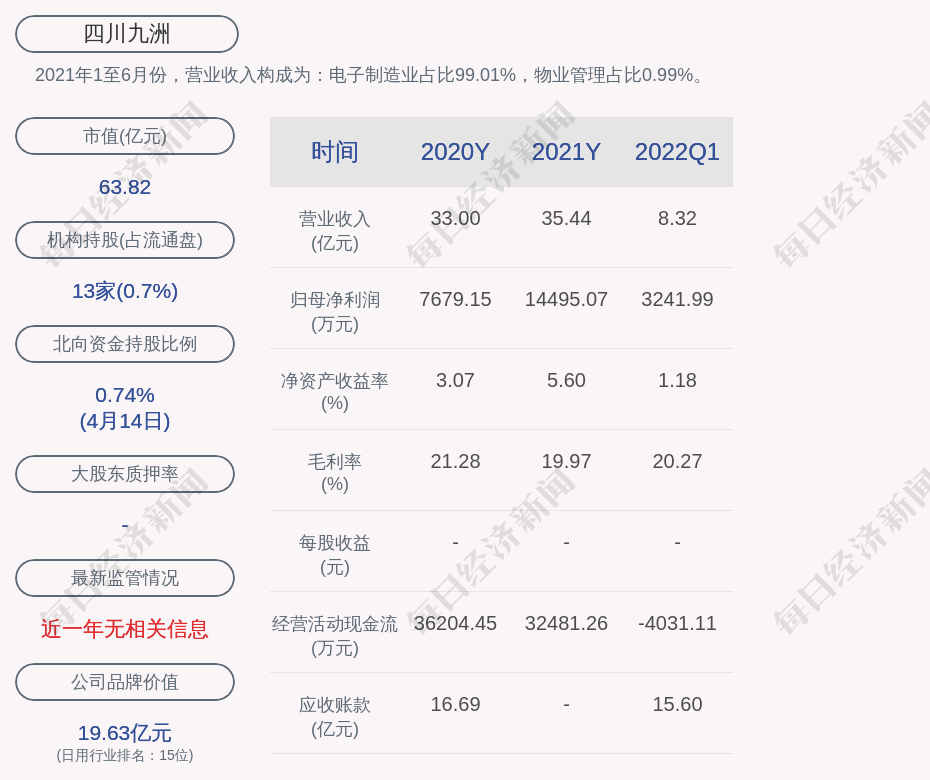 2021年1至6月份,四川九洲的营业收入构成为:电子制造业占比99.01%,物业管理占比0.99%。