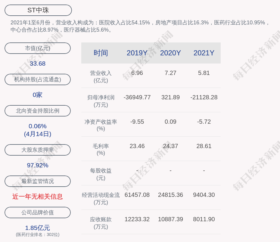2021年1至6月份,ST中珠的营业收入构成为:医院收入占比54.15%,房地产项目占比16.3%,医药行业占比10.95%,中心合作占比8.97%,医疗器械占比5.6%。