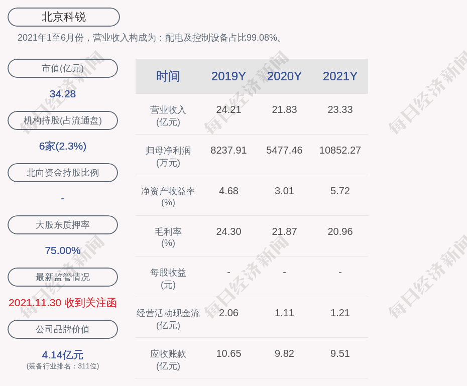 2021年1至6月份,北京科锐的营业收入构成为:配电及控制设备占比99.08%。