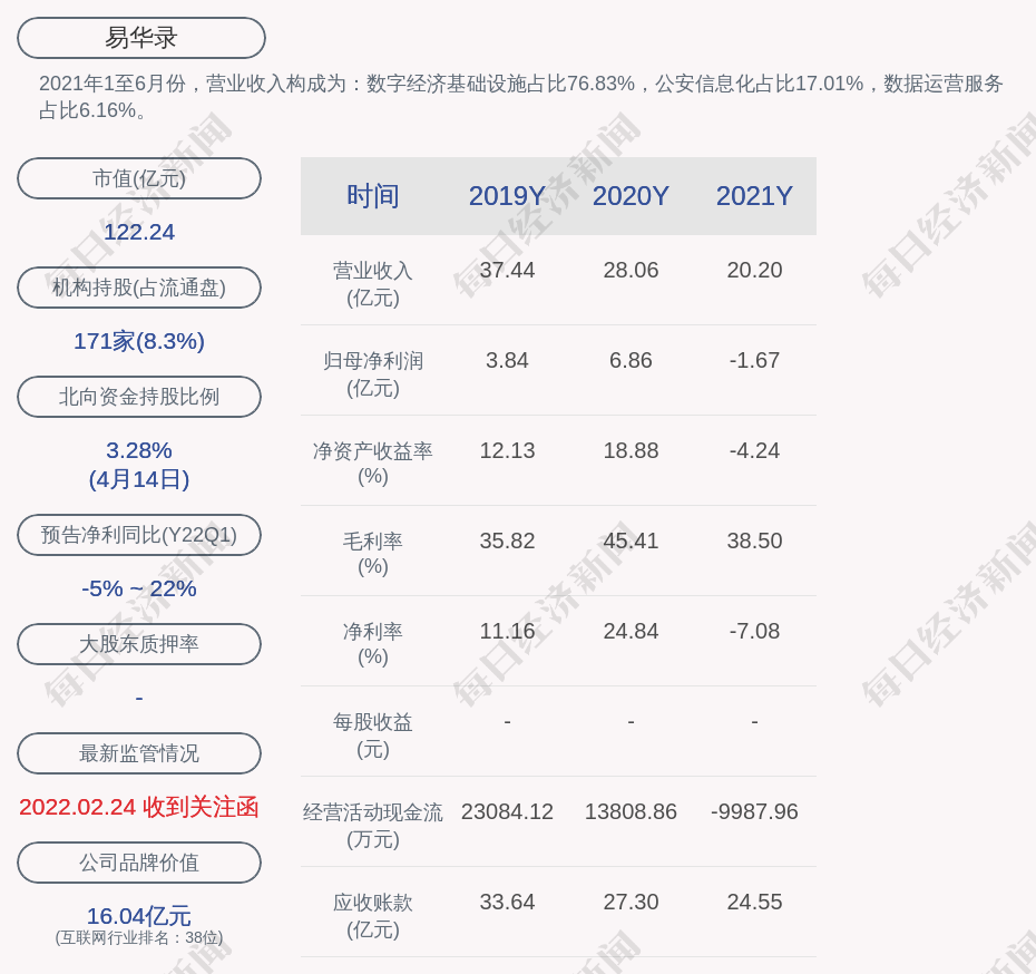 每经AI快讯,易华录(SZ 300212,收盘价:18.36元)4月19日晚间发布年度业绩报告称,2021年营业收入约20.2亿元,同比减少21.91%;归属于上市公司股东的净利润亏损约1.67亿元;基本每股收益亏损0.2529元。拟不派现、不送红股、不转增。