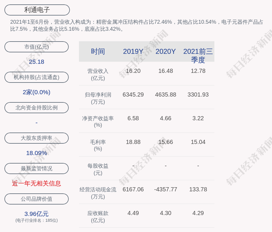 2021年1至6月份,利通电子的营业收入构成为:精密金属冲压结构件占比72.46%,其他占比10.54%,电子元器件产品占比7.5%,其他业务占比5.16%,底座占比3.42%。