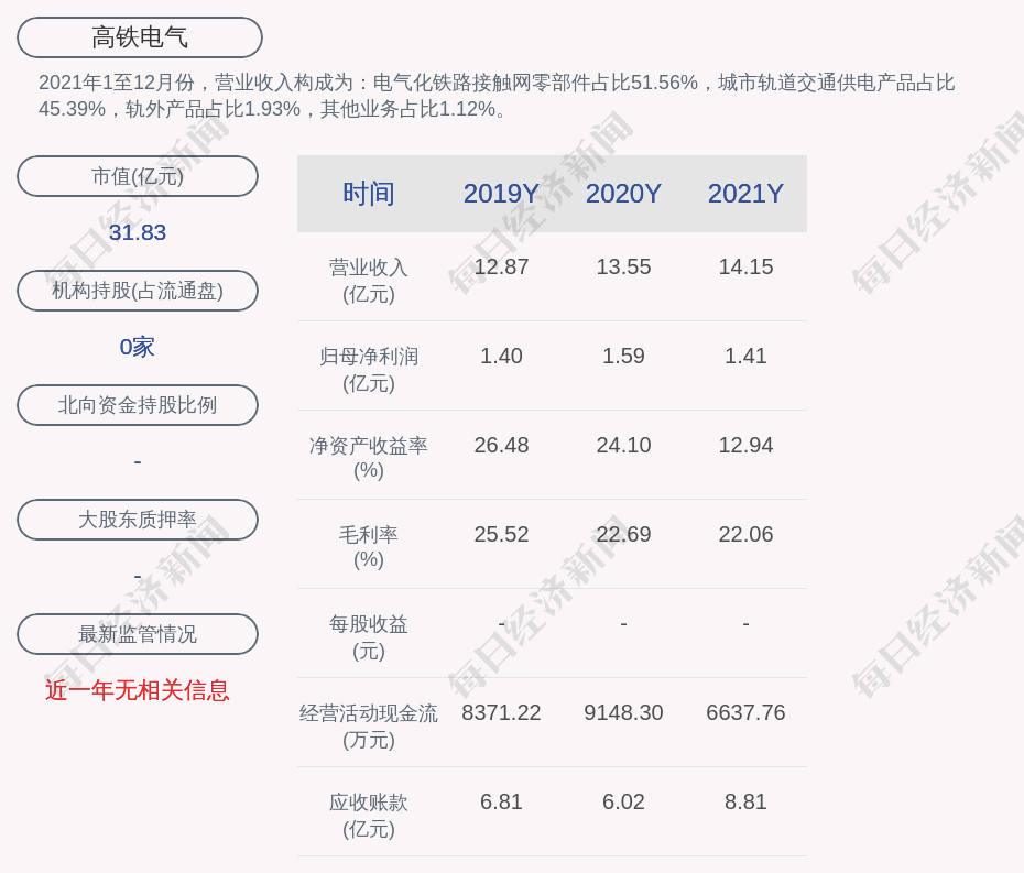 2021年1至12月份,高铁电气的营业收入构成为:电气化铁路接触网零部件占比51.56%,城市轨道交通供电产品占比45.39%,轨外产品占比1.93%,其他业务占比1.12%。