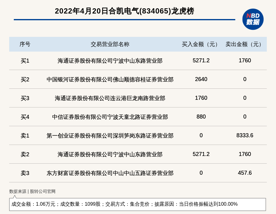 每经讯,2022年4月20日,新三板基础层公司合凯电气(834065)登上龙虎榜,交易方式是集合竞价,披露原因是当日价格振幅达到100.00%,成交数量1099股,成交金额1.06万元。买一席位为海通证券股份有限公司宁波中山东路营业部,买入5271.2元;卖一席位为第一创业证券股份有限公司深圳笋岗东路证券营业部,卖出8333.6元。