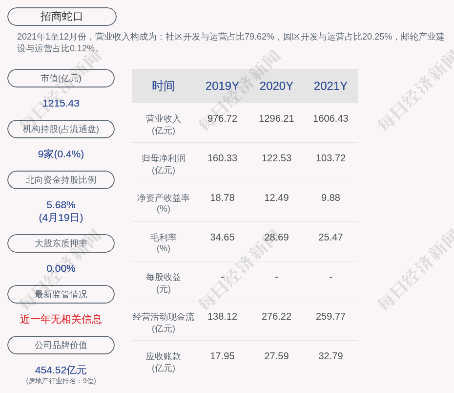 2021年1至12月份,招商蛇口的营业收入构成为:社区开发与运营占比79.62%,园区开发与运营占比20.25%,邮轮产业建设与运营占比0.12%。