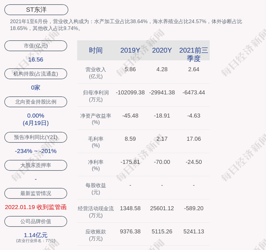 2021年1至6月份,ST东洋的营业收入构成为:水产加工业占比38.64%,海水养殖业占比24.57%,体外诊断占比18.65%,其他收入占比9.74%。