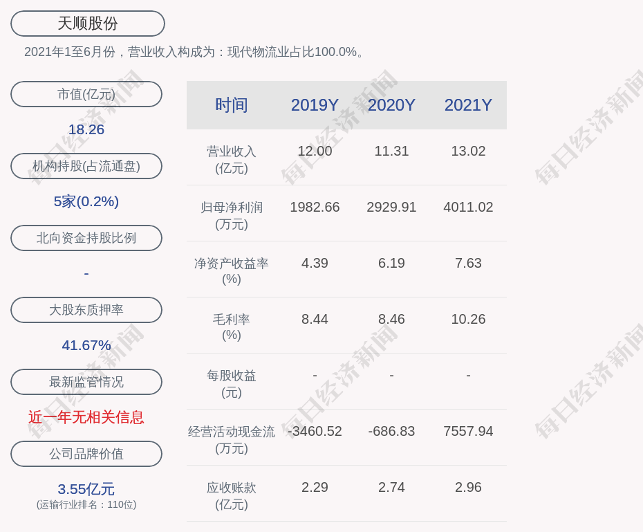 2021年1至6月份,天顺股份的营业收入构成为:现代物流业占比100.0%。