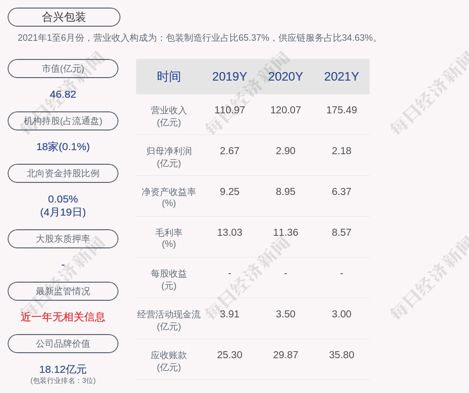 2021年1至6月份,合兴包装的营业收入构成为:包装制造行业占比65.37%,供应链服务占比34.63%。