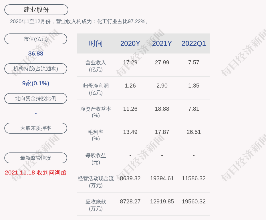 2020年1至12月份,建业股份的营业收入构成为:化工行业占比97.22%。