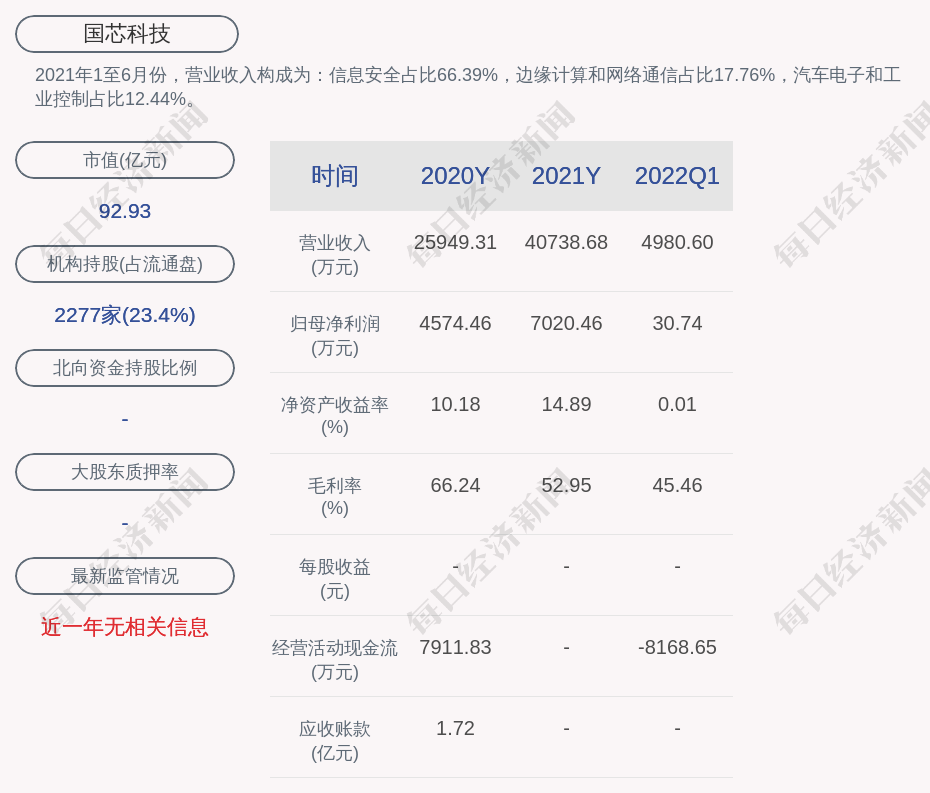 2021年1至6月份,国芯科技的营业收入构成为:信息安全占比66.39%,边缘计算和网络通信占比17.76%,汽车电子和工业控制占比12.44%。