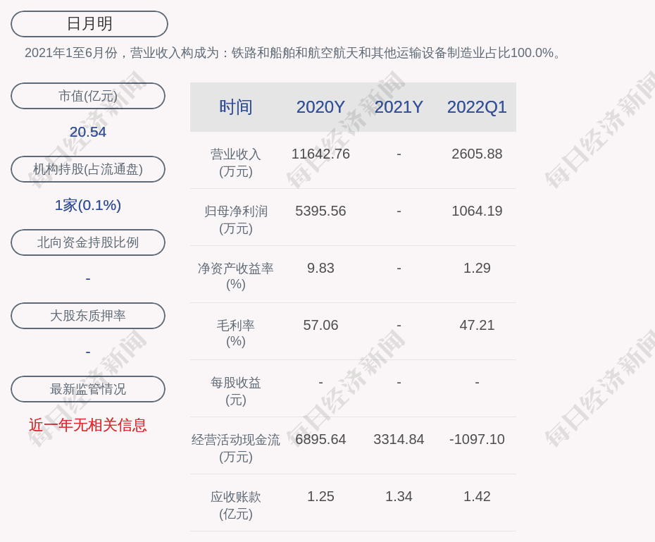 2021年1至6月份,日月明的营业收入构成为:铁路和船舶和航空航天和其他运输设备制造业占比100.0%。
