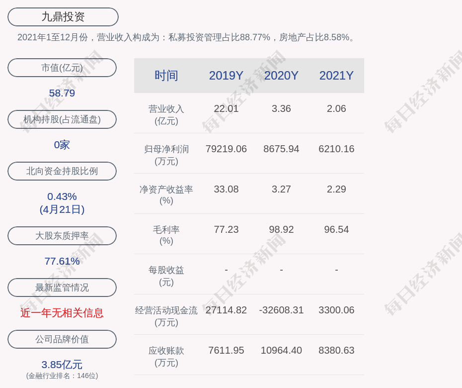 2021年1至12月份,九鼎投资的营业收入构成为:私募投资管理占比88.77%,房地产占比8.58%。