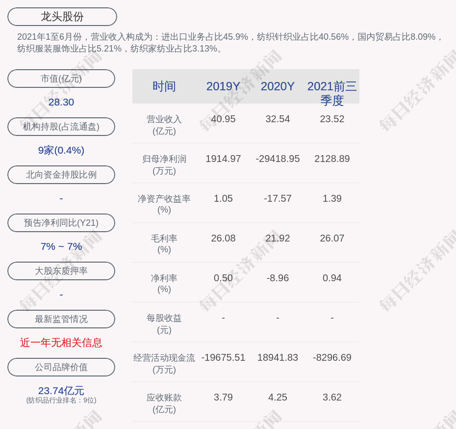 2021年1至6月份,龙头股份的营业收入构成为:进出口业务占比45.9%,纺织针织业占比40.56%,国内贸易占比8.09%,纺织服装服饰业占比5.21%,纺织家纺业占比3.13%。