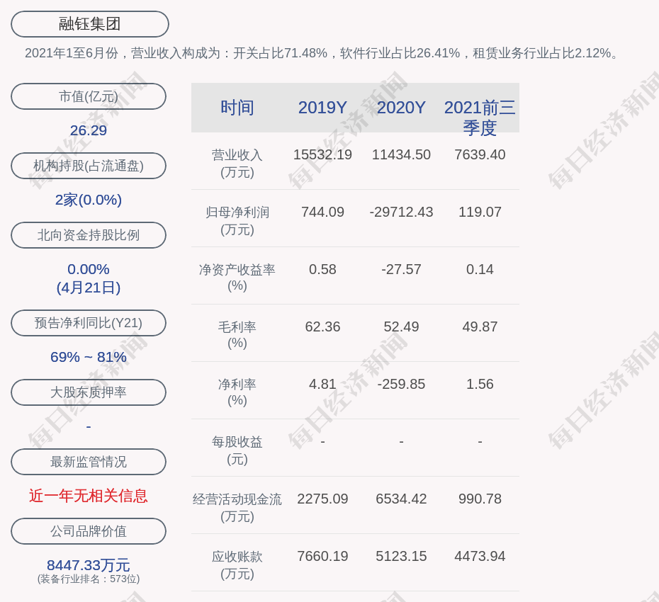 2021年1至6月份,融钰集团的营业收入构成为:开关占比71.48%,软件行业占比26.41%,租赁业务行业占比2.12%。