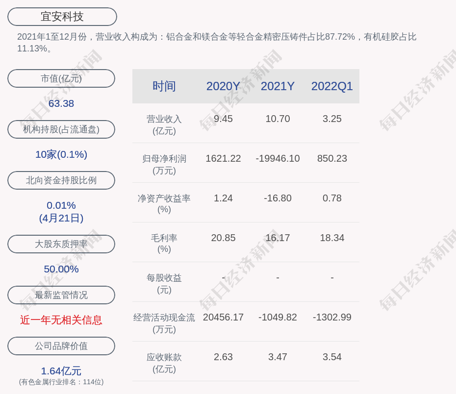每经AI快讯,宜安科技(SZ 300328,收盘价:9.18元)4月22日晚间发布一季度业绩公告称,2022年第一季度营收约3.25亿元,同比增加41.47%;净利润约850万元,同比增加637.05%;基本每股收益0.0123元,同比增加623.53%。
