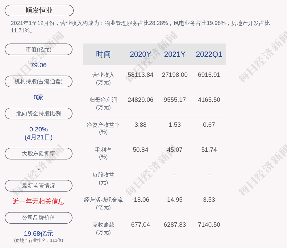 2021年1至12月份,顺发恒业的营业收入构成为:物业管理服务占比28.28%,风电业务占比19.98%,房地产开发占比11.71%。