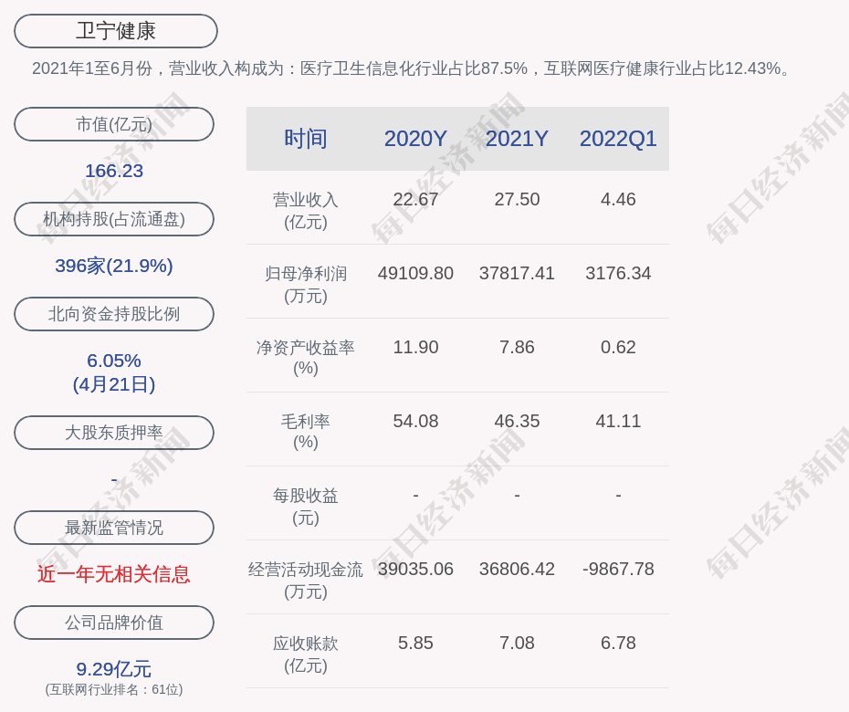 2021年1至6月份,卫宁健康的营业收入构成为:医疗卫生信息化行业占比87.5%,互联网医疗健康行业占比12.43%。