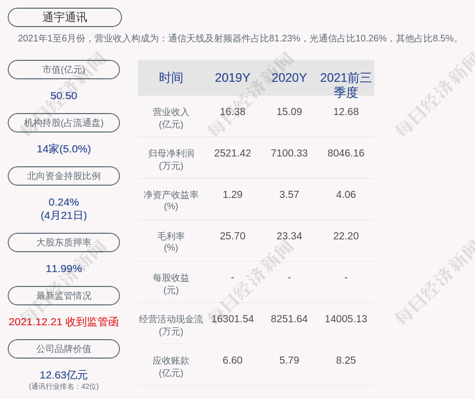 2021年1至6月份,通宇通讯的营业收入构成为:通信天线及射频器件占比81.23%,光通信占比10.26%,其他占比8.5%。