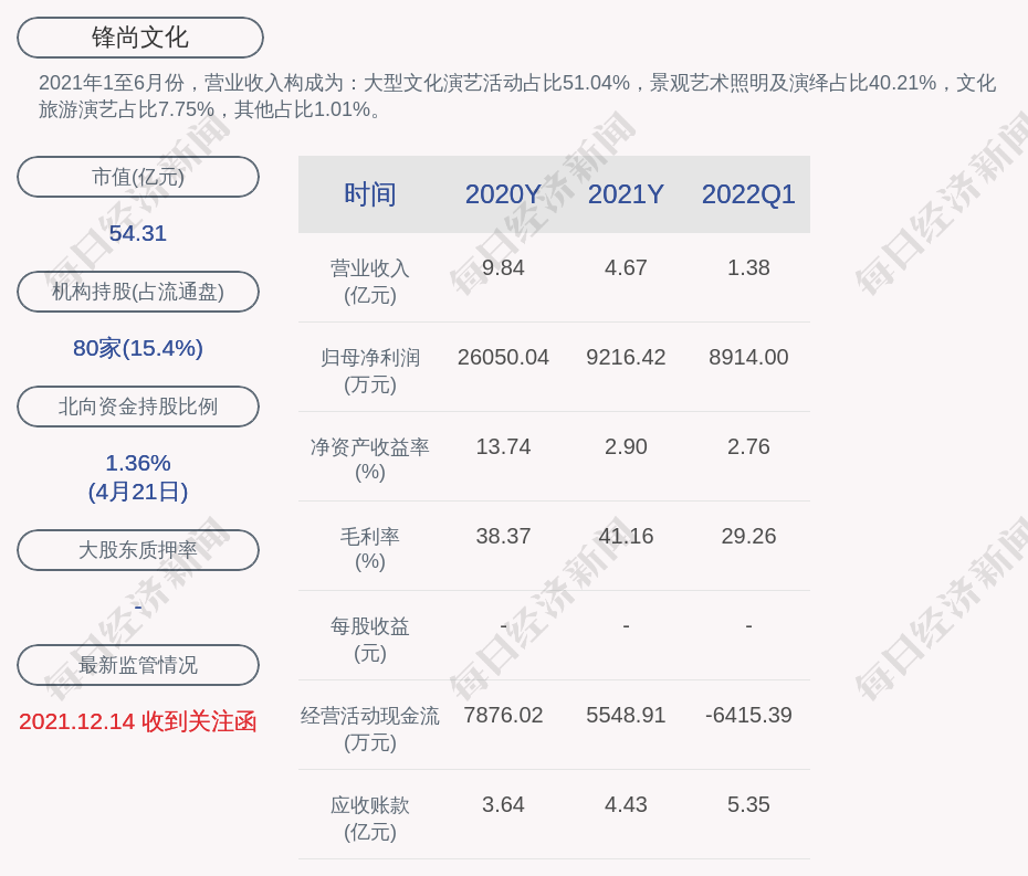 每经AI快讯,锋尚文化(SZ 300860,收盘价:39.57元)4月22日晚间发布一季度业绩公告称,2022年第一季度营收约1.38亿元,同比增加31.38%;净利润约8914万元,同比增加212.03%;基本每股收益0.65元,同比增加209.52%。