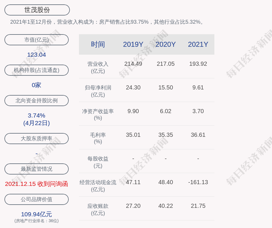 每经AI快讯,世茂股份(SH 600823,收盘价:3.28元)4月23日发布年度业绩报告称,2021年营业收入约193.92亿元,同比减少10.66%;归属于上市公司股东的净利润约9.61亿元,同比减少38.01%;基本每股收益0.26元,同比减少36.59%。拟不派现、不送红股、不转增。