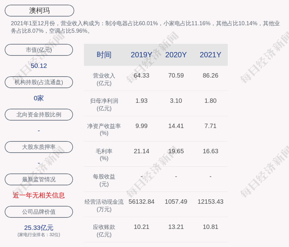 2021年1至12月份,澳柯玛的营业收入构成为:制冷电器占比60.01%,小家电占比11.16%,其他占比10.14%,其他业务占比8.07%,空调占比5.96%。