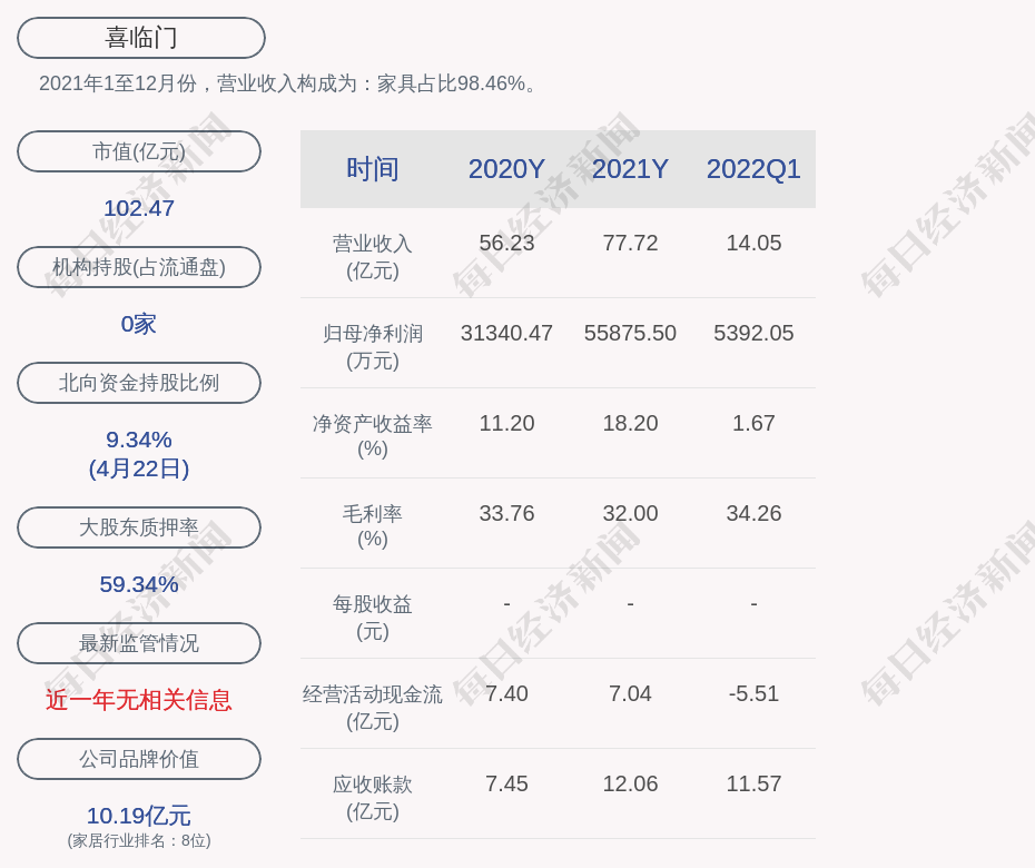 2021年1至12月份,喜临门的营业收入构成为:家具占比98.46%。