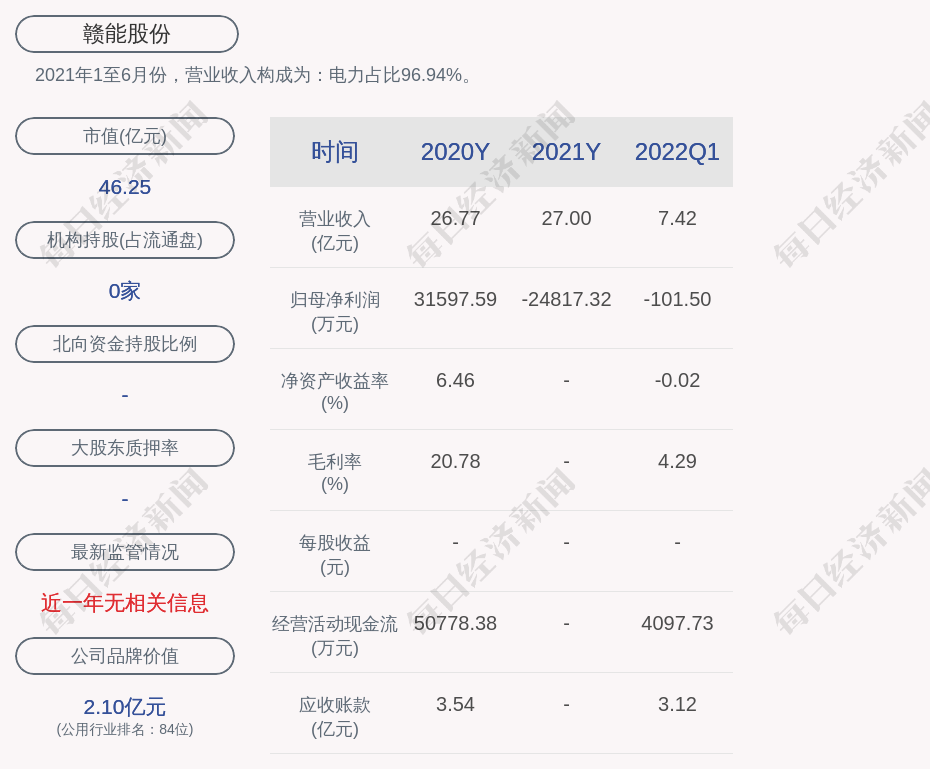 2021年1至6月份,赣能股份的营业收入构成为:电力占比96.94%。