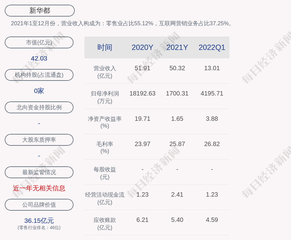 2021年1至12月份,新华都的营业收入构成为:零售业占比55.12%,互联网营销业务占比37.25%。