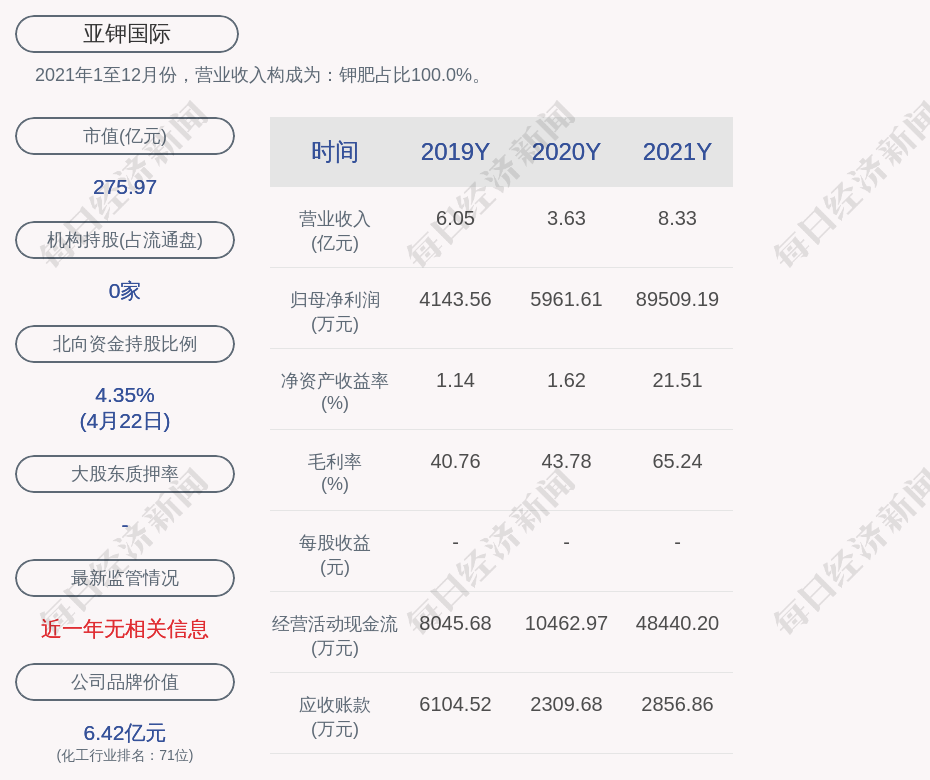 2021年1至12月份,亚钾国际的营业收入构成为:钾肥占比100.0%。