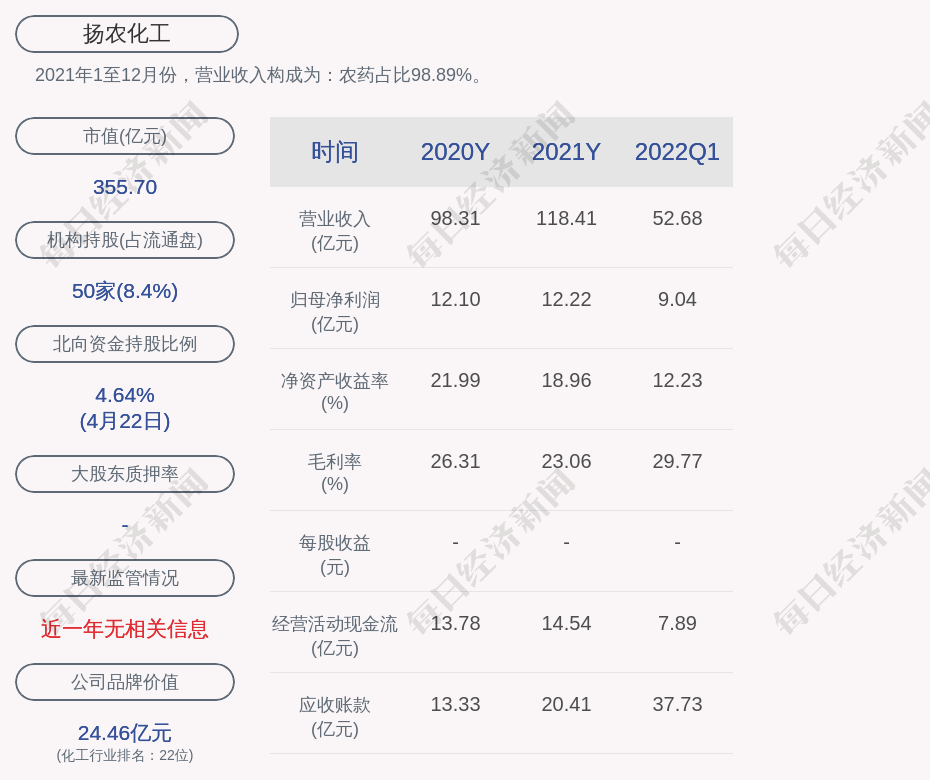 每经AI快讯,扬农化工(SH 600486,收盘价:114.78元)4月25日晚间发布一季度业绩公告称,2022年第一季度营收约52.68亿元;净利润约9.04亿元;基本每股收益约2.92元。