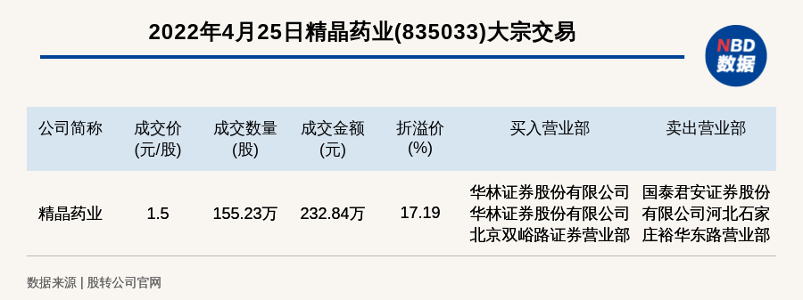 每经讯,2022年4月25日,新三板创新层公司精晶药业(835033)发生一笔大宗交易,成交价1.5元/股,成交数量155.23万股,成交金额232.84万元,溢价17.19%。