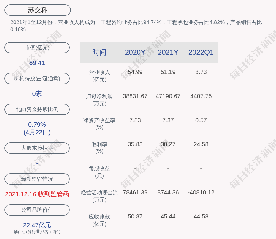2021年1至12月份,苏交科的营业收入构成为:工程咨询业务占比94.74%,工程承包业务占比4.82%,产品销售占比0.16%。
