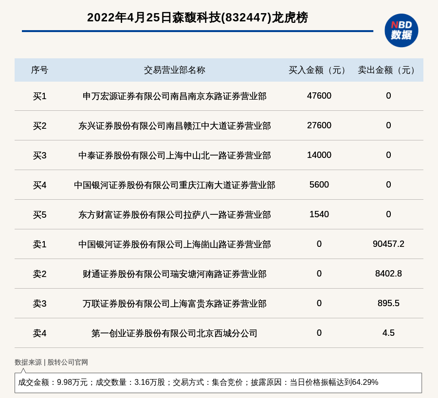每经讯,2022年4月25日,新三板基础层公司森馥科技(832447)登上龙虎榜,交易方式是集合竞价,披露原因是当日价格振幅达到64.29%,成交数量3.16万股,成交金额9.98万元。买一席位为申万宏源证券有限公司南昌南京东路证券营业部,买入4.76万元;卖一席位为中国银河证券股份有限公司上海崮山路证券营业部,卖出9.05万元。